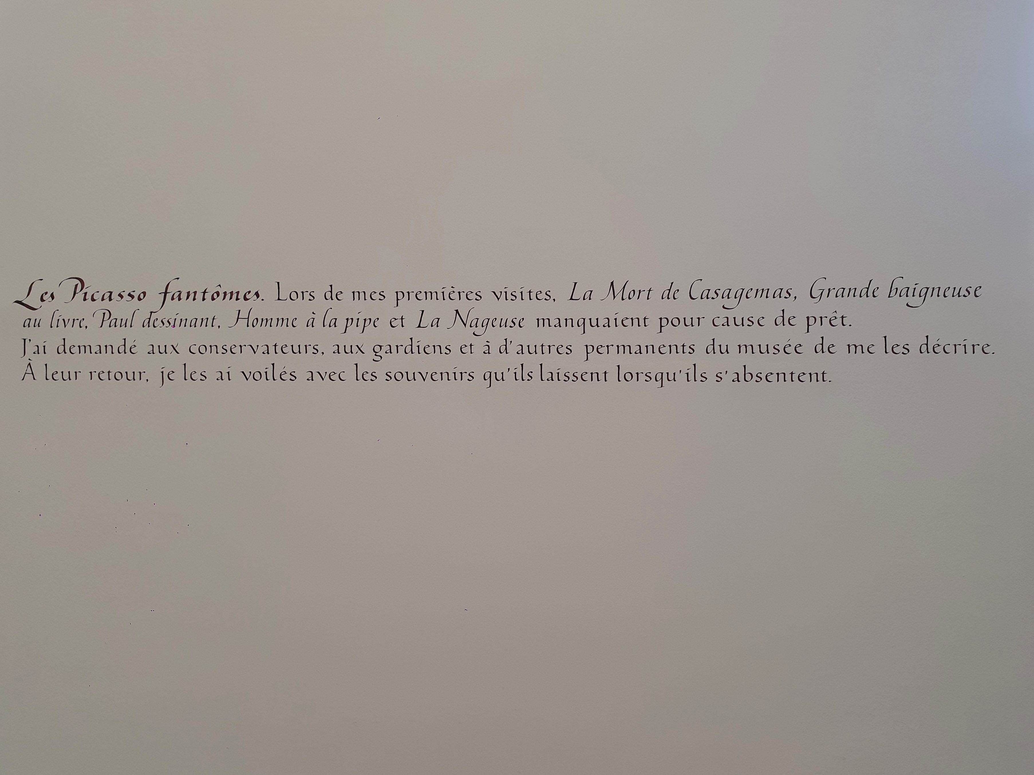 *“‘Paul Drawing’, ‘Man with a Pipe’, ‘Swimming Woman’, ‘The Death of Casagemas’ and ‘Bather with a book’ were missing due to loan. I asked the curators, guards and other museum staff to describe them to me” When they returned, I veiled them in the memories they leave behind their absence”