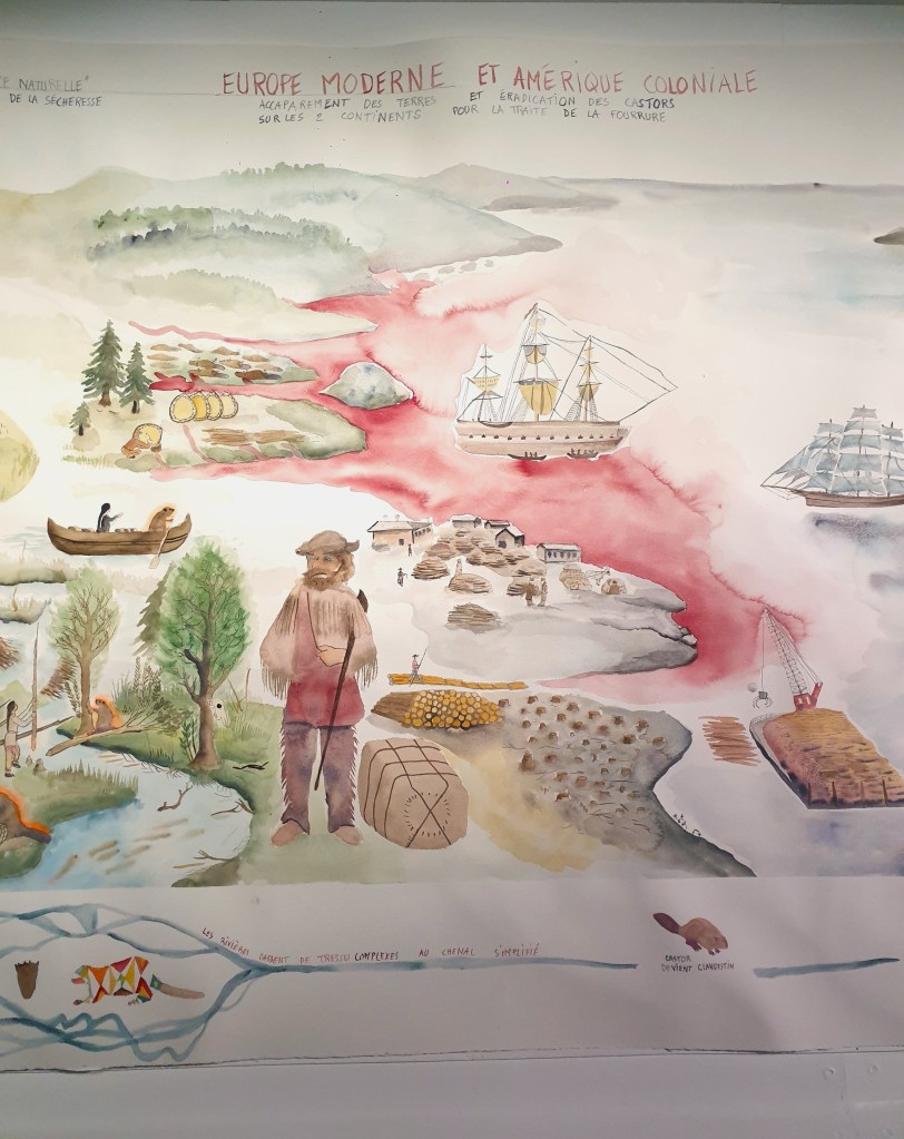 Drawing inspiration and data from the 2022 GIEC report, Husky highlights how beavers could serve as a solution to combat climate change. The exhibition thus holds both visual and scientific interests, serving as a form of visual documentation. One notable piece is the frieze titled “A Geopolitical History of Alliances between Humans and Beavers through the Ages,” which chronologically represents the decline of beavers in our ecosystems due to human activities, emphasizing the crucial role of this animal. Spanning almost eight meters in length, the frieze serves as a compelling testament that tells the geopolitical story of human-beaver alliances through the ages.