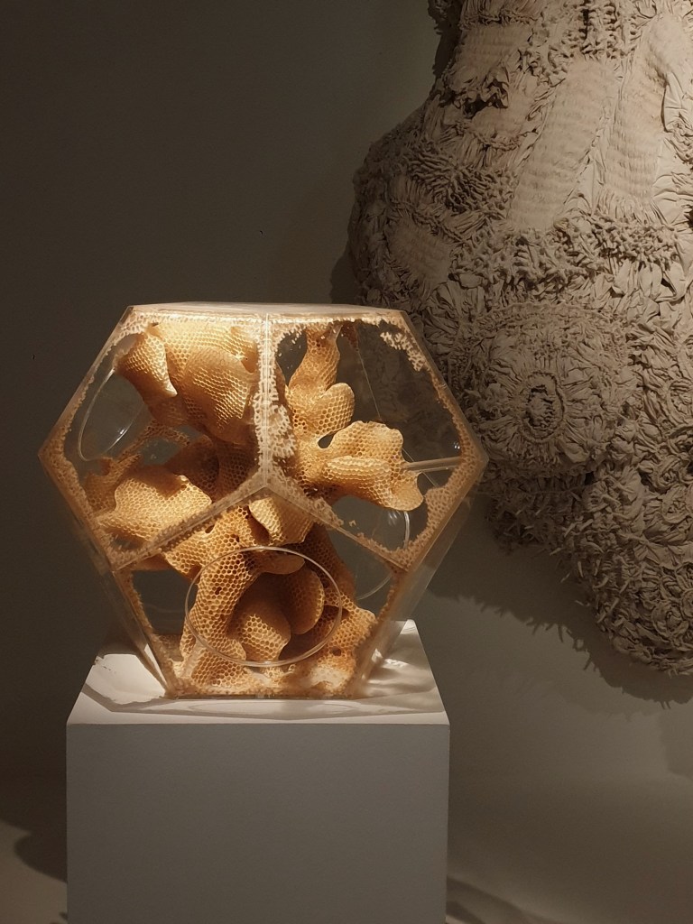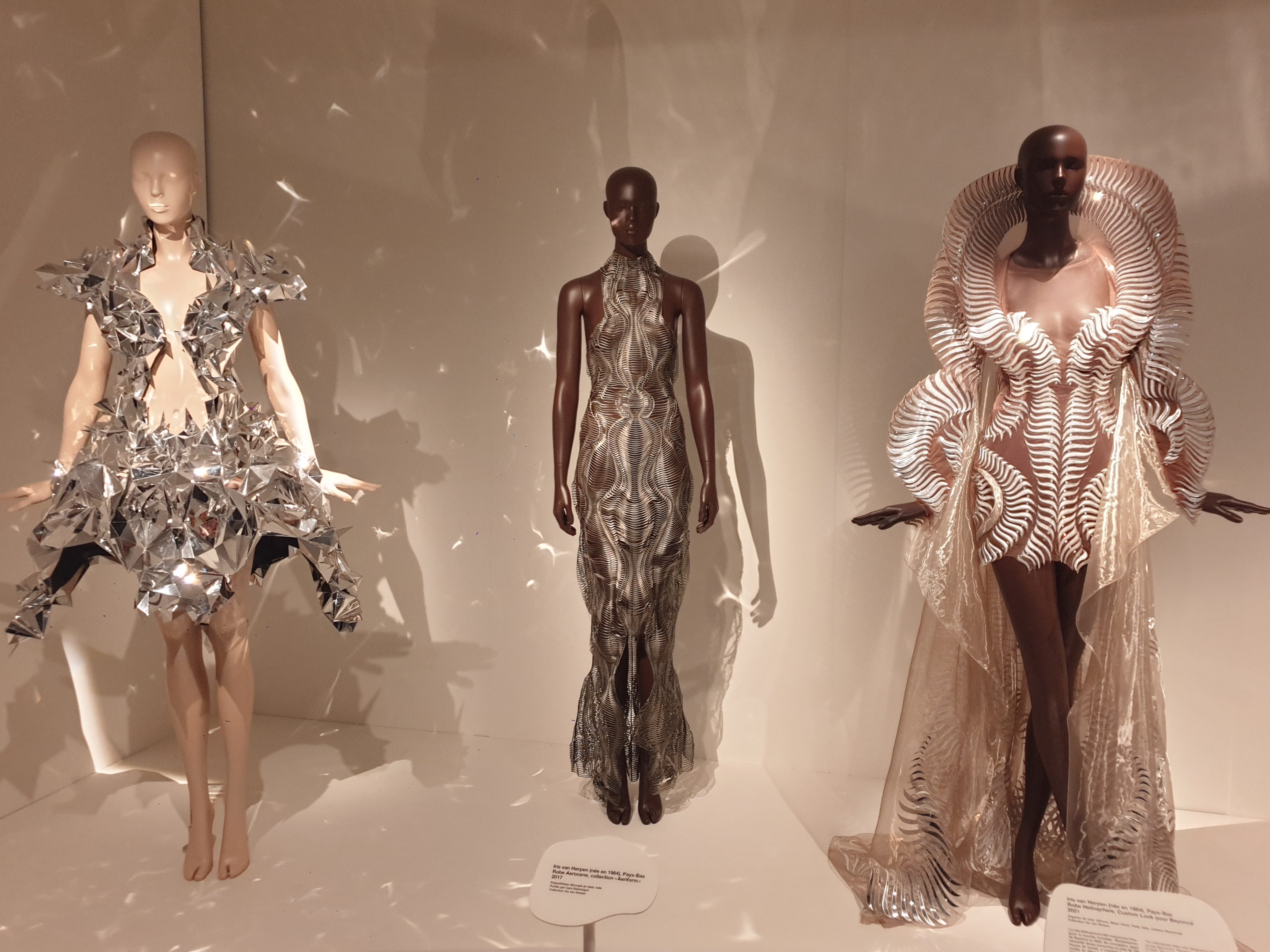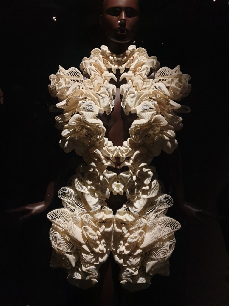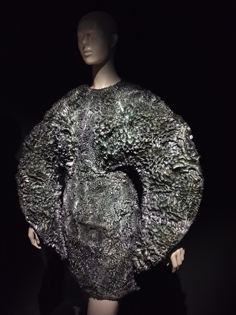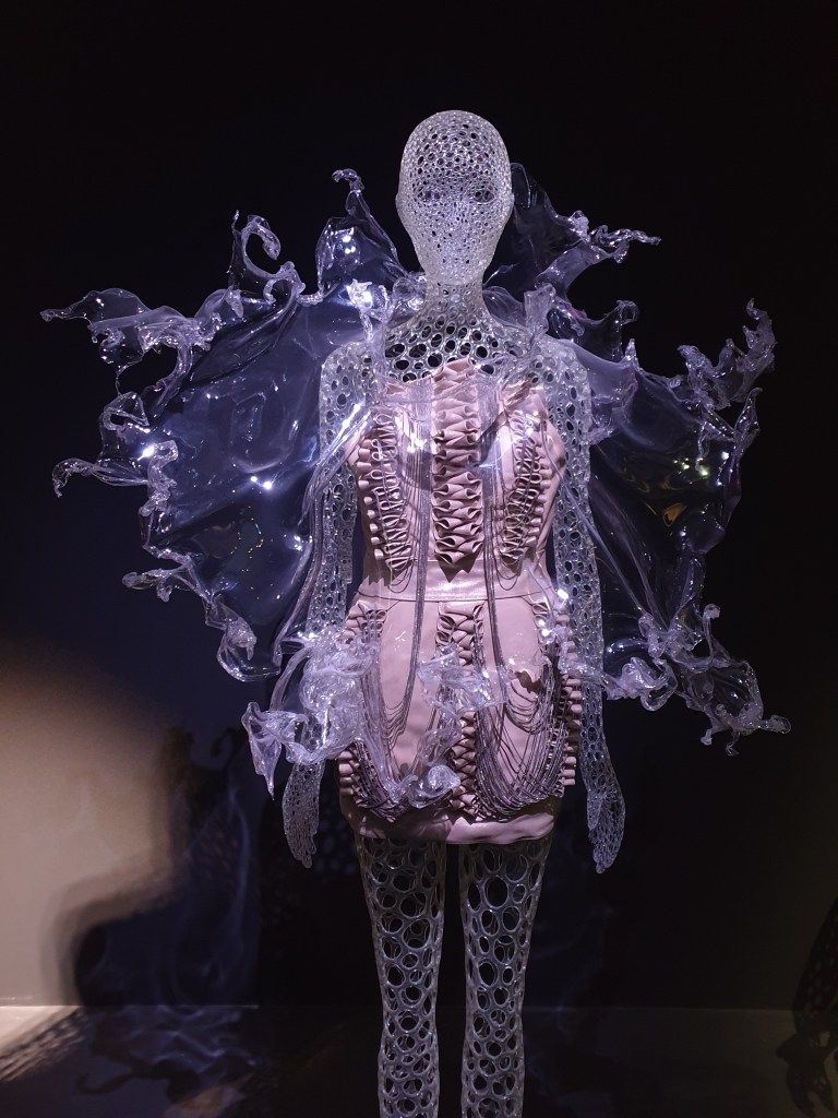 This scrupulous research on what surrounds her extends to the materials: Iris van Harpen conceives her creations with such a holystique approach that made her immediately recognizable. Leveraging both natural and artificial sources, she transforms and processes raw materials, often incorporating cutting-edge technologies. Visitors encounter garments crafted from organza glass, 3D-printed polymers, and screen-printed silk, and their iconic cuts and shapes further accentuate the innovation of her style.