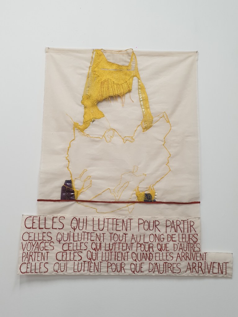 Every artist expresses the condition of exile in different manners. Some convey a sort of sense of melancholy for what it was left behind, as seen in the series of photographs by Sara Kontar (Lebanese). Others emphasize the act of bearing witness, recognizing its difficulty but essentiality in ensuring that stories are not left untold, as evident in the practice of Bissane al Charid (born in France but studied in Syria). Some depict personal experiences, such as the event recounted in the leporello by Randa Maddah (born in Golan, land occupied by Isreal) and those who on the contrary commit to “showing for others”, touched by indirect experiences of immigration, like the French artist Cathryn Boch. After moving to Marseille where she currently lives, Boch seeks to transcribe the stories of the many immigrants in the city, literally “sewing” their narratives to convey a message of urgency and hope for future generations.
