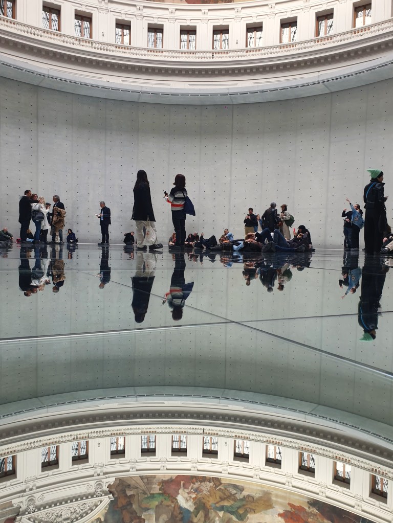 Entering in the exhibition is from the first moment a unique sensory experience, with the installation To Breathe- Constellation by the artist Kimsooja. Spectacular in its effect, the installation is made of mirrors posed on the Rotonde’s floor, reflecting the iconic majestic dome of the Bourse de Commerce. The visitor can walk freely in the space, with the illusion of walking suspended in the air. The artworks aims to be a contemplative environment where the void, created by the illusion of being inside a sphere, becomes the protagonist.