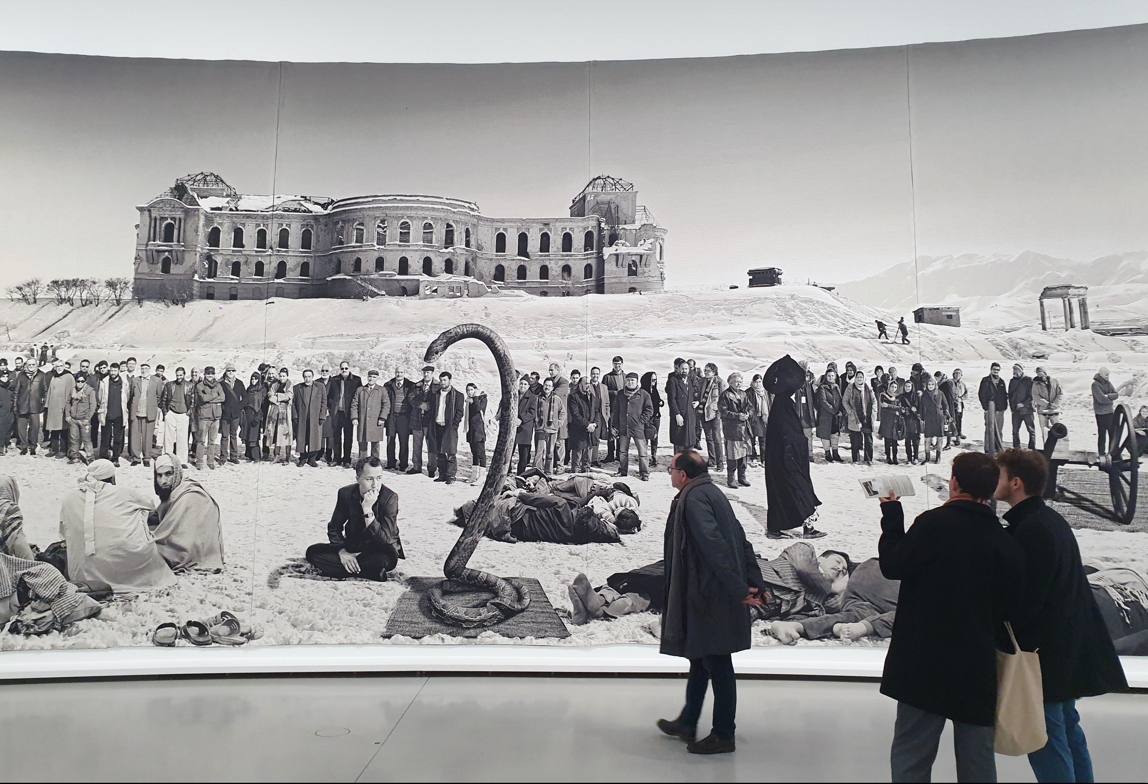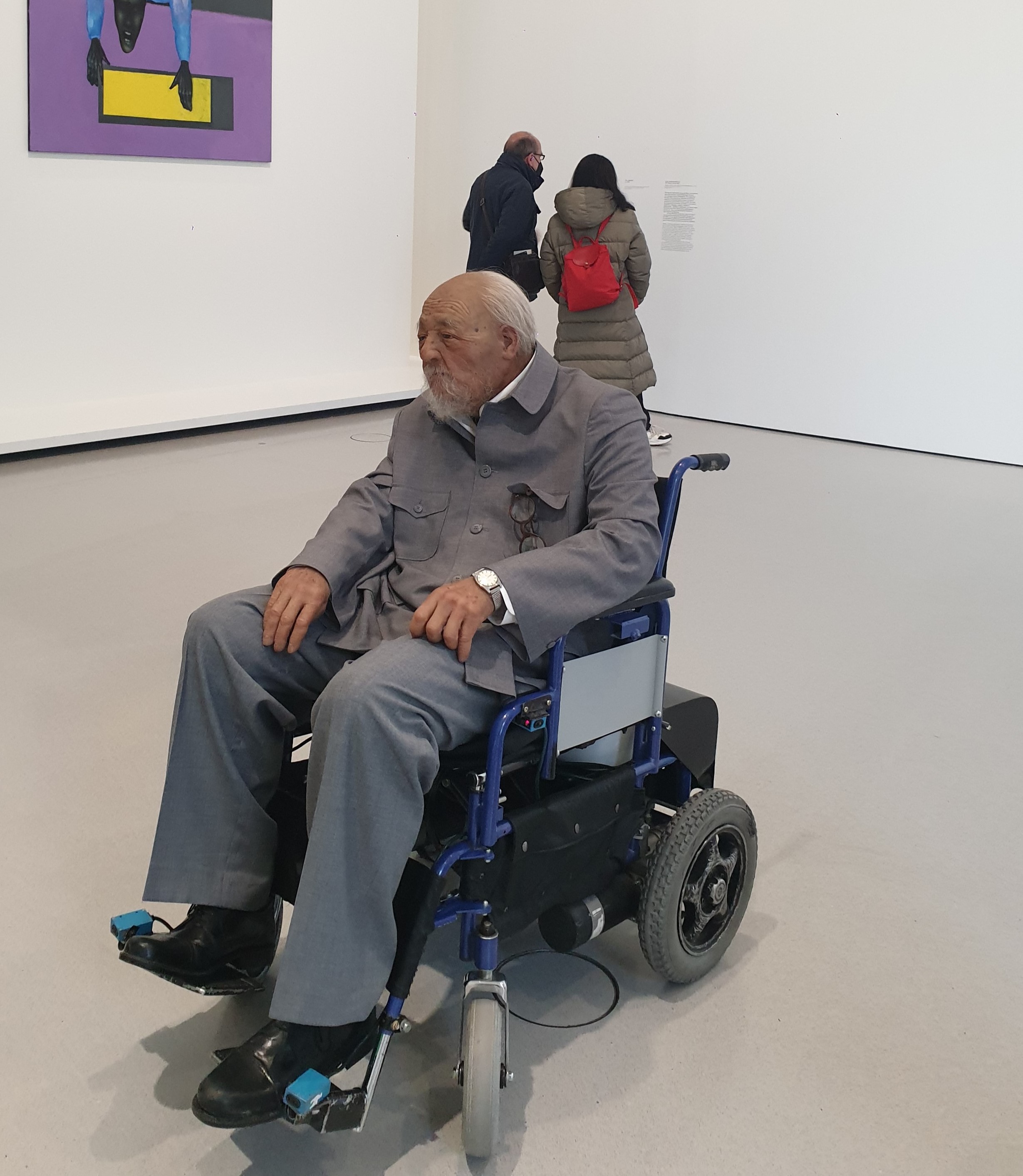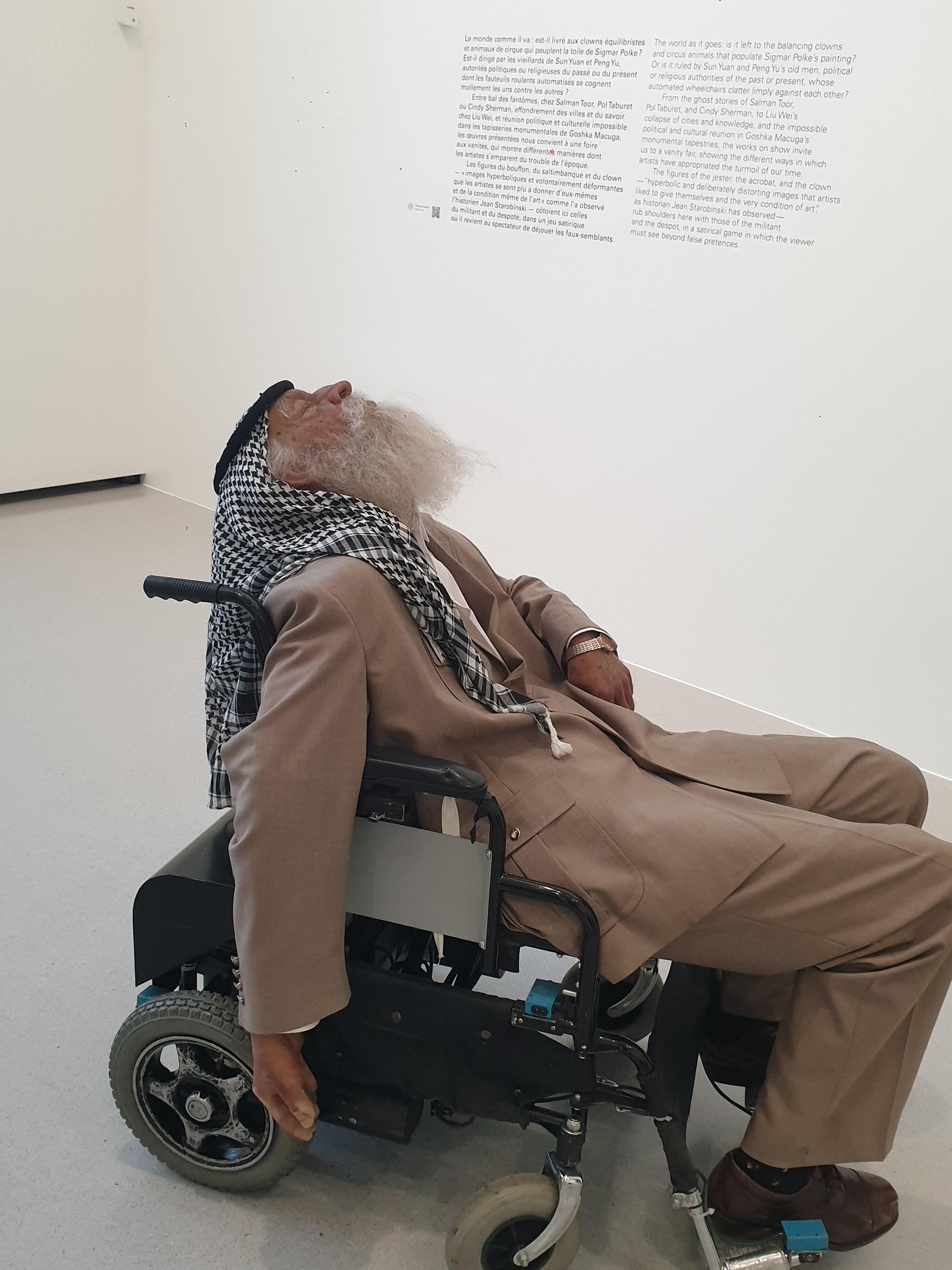 The exhibition spans all over the surfaces of the Bourse, including the auditorium and the basement, divided thematically to explore various aspects of the human experience in our contemporary world. On the ground floor, the section called “La comédie humaine” (The Human comedy) proposes satirical reflections on the vanities of our era. Monumental tapestries by Goshka Macuga depicting improbable meetings of political and cultural figures immediately capture attention. Automated hyper-realistic sculptures by Sun Yuan& Peng Yu add to the strange surreal atmosphere, featuring elderly figures in wheelchairs resembling political and religious authorities aimlessly wondering among visitors