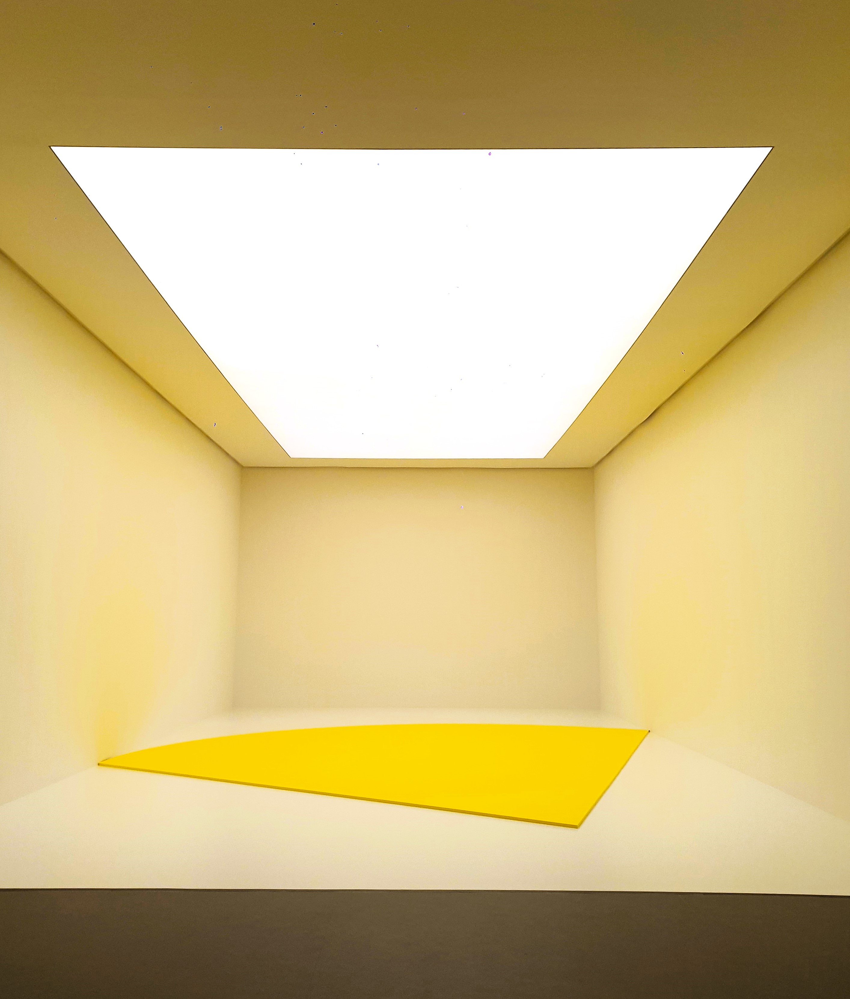 The exhibition continues in the auditorium, where a permanent work by Kelly fills the space. For this and many other permanent installations he made for museums and institutions worldwide, the architecture of the place is essential in shaping the final result. In the auditorium, visitors are invited to walk around the room and discover the five colored panels and the immediate impact of “Spectrum VIII” (2014), which immediately catches the eye.