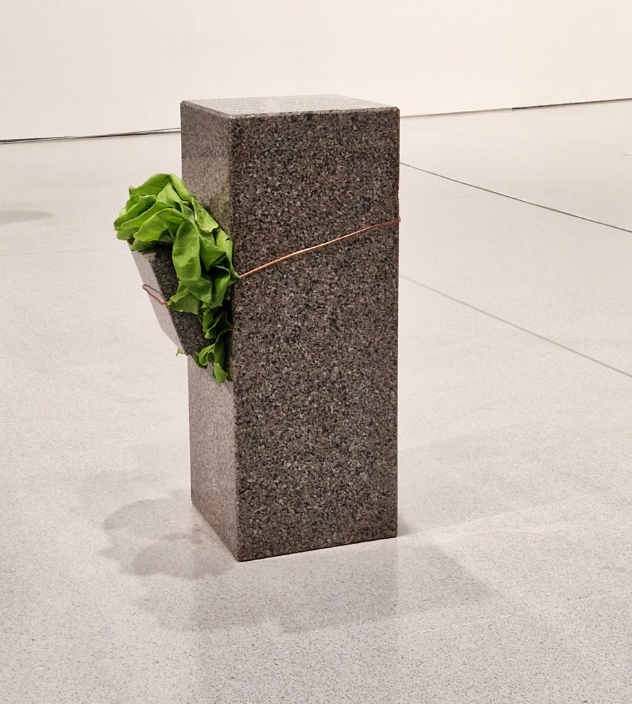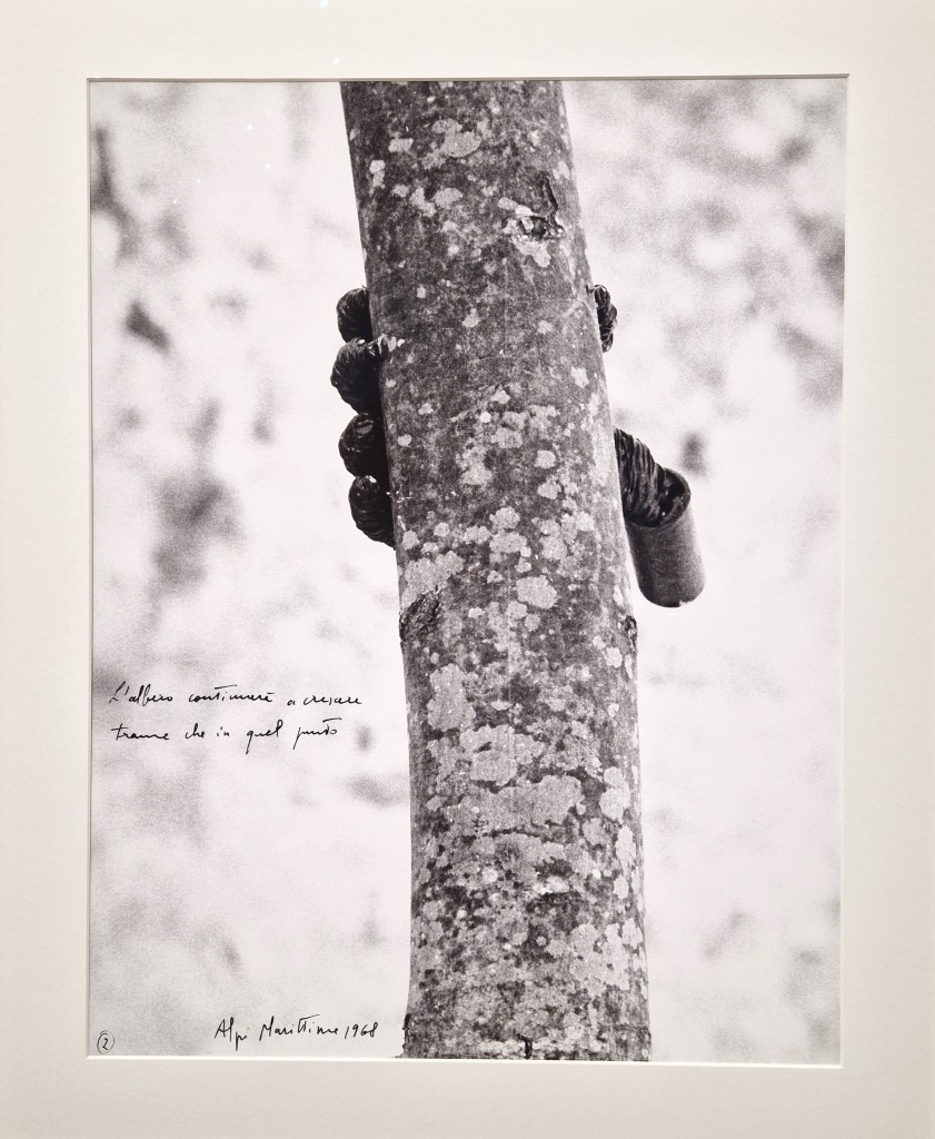 Some of the works reflect the provocative nature of many Arte Povera pieces. One example is Giovanni Anselmo’s Sculpture That Eats, which exemplifies his fascination with the physical forces that rule our world. The piece features a lettuce that must be periodically replaced to prevent it from rotting and thus losing the tension that holds a stone in place, risking its collapse. Many works reflect this connection with nature, as it is evident in Giovanni Penone’s work. The artist explore the relationship between humans and nature, particularly trees, in his vision of the world which is the opposite of anthropocentrism. Other works highlight the spirit of experimentation that defined the movement, such as Zorio’s installations in the basement, which push the boundaries of materials and question what it means doing art.