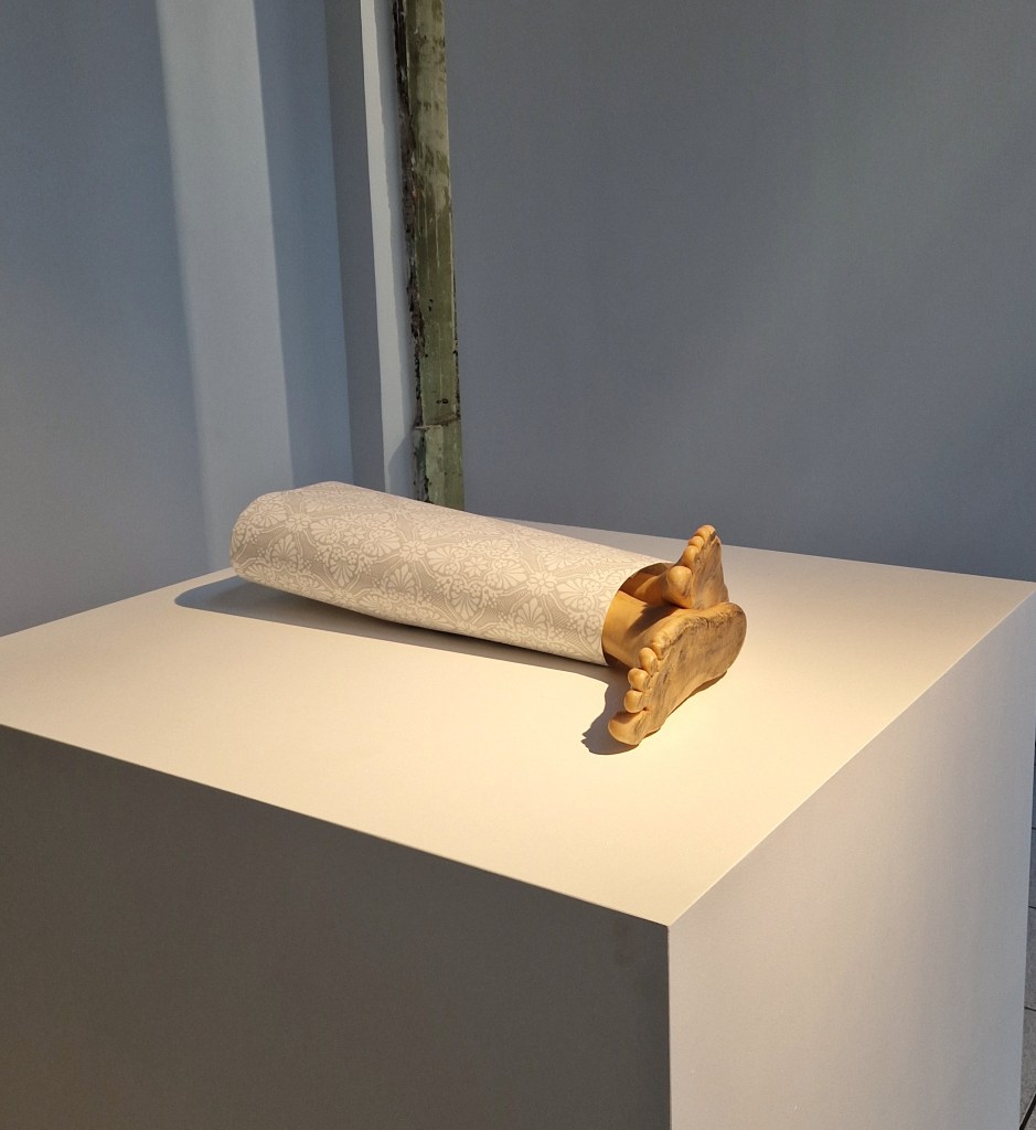 The artworks on display engage deeply with pressing contemporary issues. Among them, Veil of the Sole by Sislej Xhafa stands out in one of the first rooms, visible from the outside of the gallery. This sculpture presents two left feet—symbols of missteps and, metaphorically, of those left behind. It serves as a hymn to resilience and solidarity, challenging perceptions and drawing attention to the overlooked and marginalized.