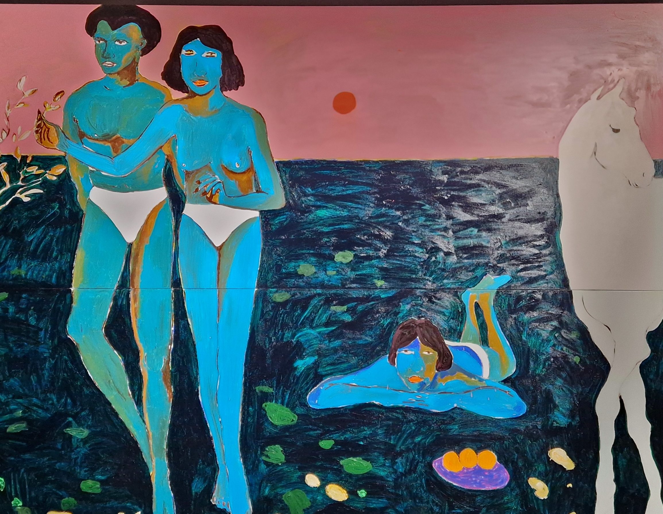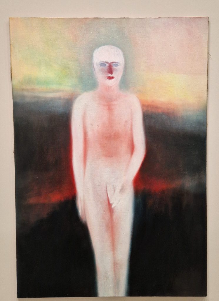 The “soul” invoked in the exhibition’s title finds its most evocative expression in the works of Miriam Cahn. Her installation Ritual reflects on the ephemerality of human existence and the artist’s personal experience accompanying her father through illness and death. This section leads to what is arguably the most spectacular piece in the exhibition: Georg Baselitz’s Avignon. Known for his upside-down figures, Baselitz here presents eight monumental canvases in a dimly lit room, creating an immersive and suggestive space. The viewer is overwhelmed by the scale and gravity of these presences.