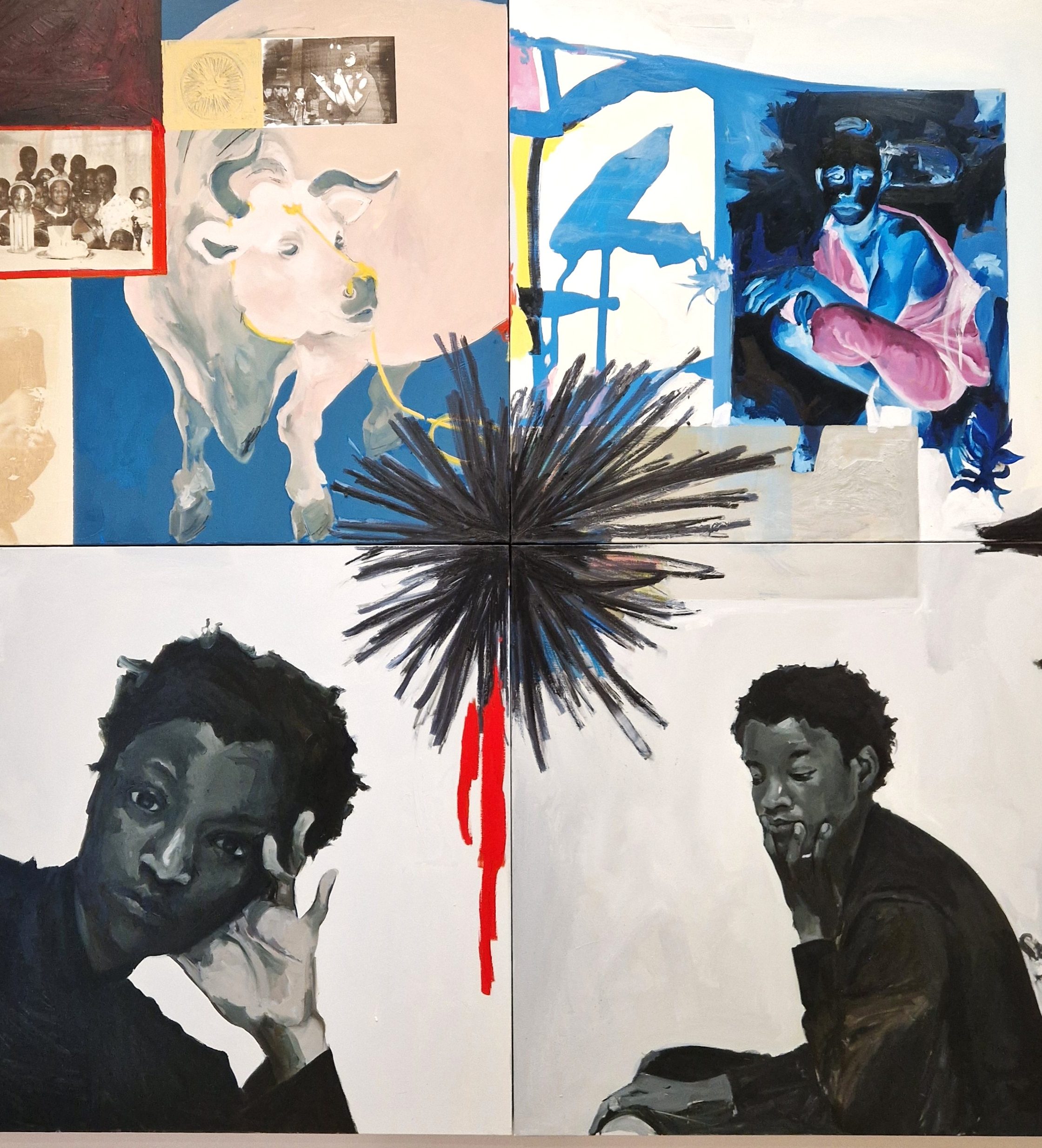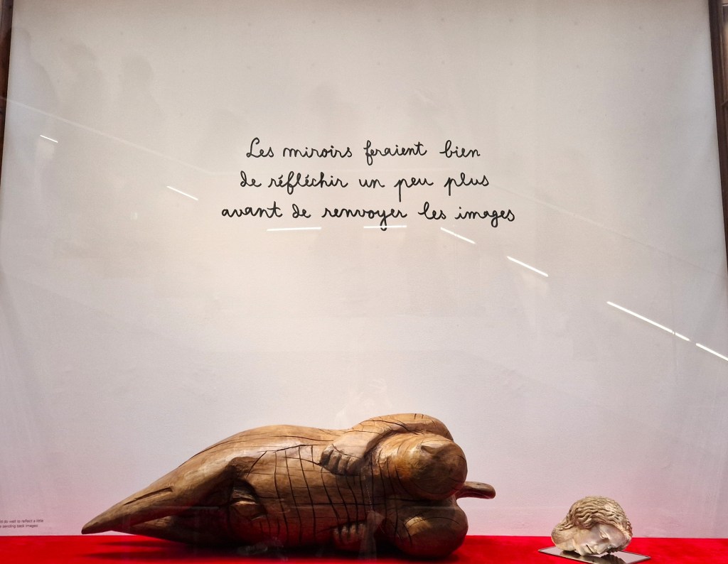 This focus is immediately apparent in the Salon, where visitors are greeted by two large-scale canvases by Ghanaian painter Gideon Appah. Next, surrounding the Rotonde, the vitrines are occupied by works from Ali Cherri, who assembles archaeological fragments with newly created elements, crafting fictive artifacts. This gesture invites reflection on the manipulation of artifacts and cultural heritage and proposes alternative, personal mythologies—echoes of Cherri’s own fragmented identity, shaped by Lebanon’s history of instability and conflict. The sculptures are accompanied by quotes from Jean Cocteau’s Le Sang d’un poète, infusing the installations with a surreal, dreamlike atmosphere.