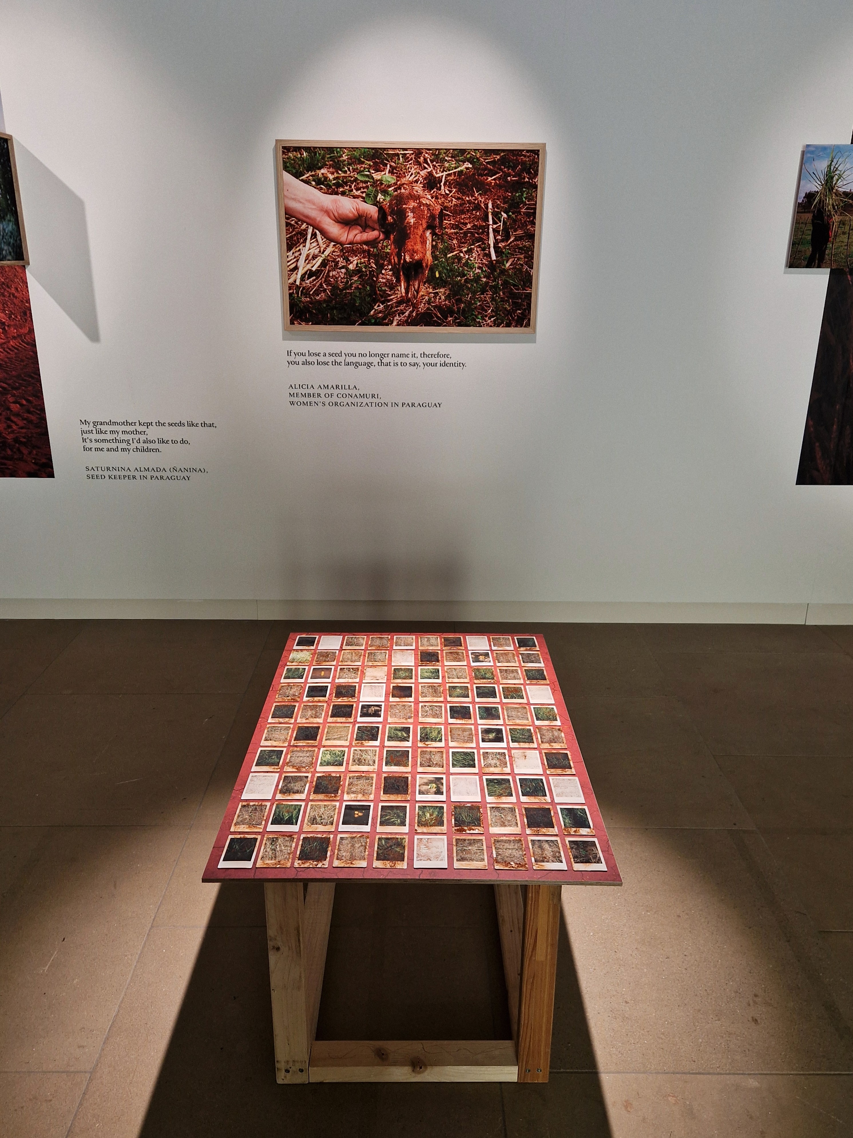 The second room transports us to Paraguay with the Ra’yi series, which addresses the country’s extreme land inequality: 2.5% of the population owns 85% of arable land, primarily devoted to transgenic monoculture for the export market. Through an installation of one hundred seed polaroids, the artist materializes this staggering statistic : 94 lots of land are own today by agri-businesses which export transgenic plants, while just 6 lots are left for local farmers to cultivate traditional seeds destined to the country. Yet Romero also highlights the resistance of women’s groups in Altos, who cultivate, exchange, and protect native seeds as acts of identity and linguistic preservation inherited from the ancestrors.