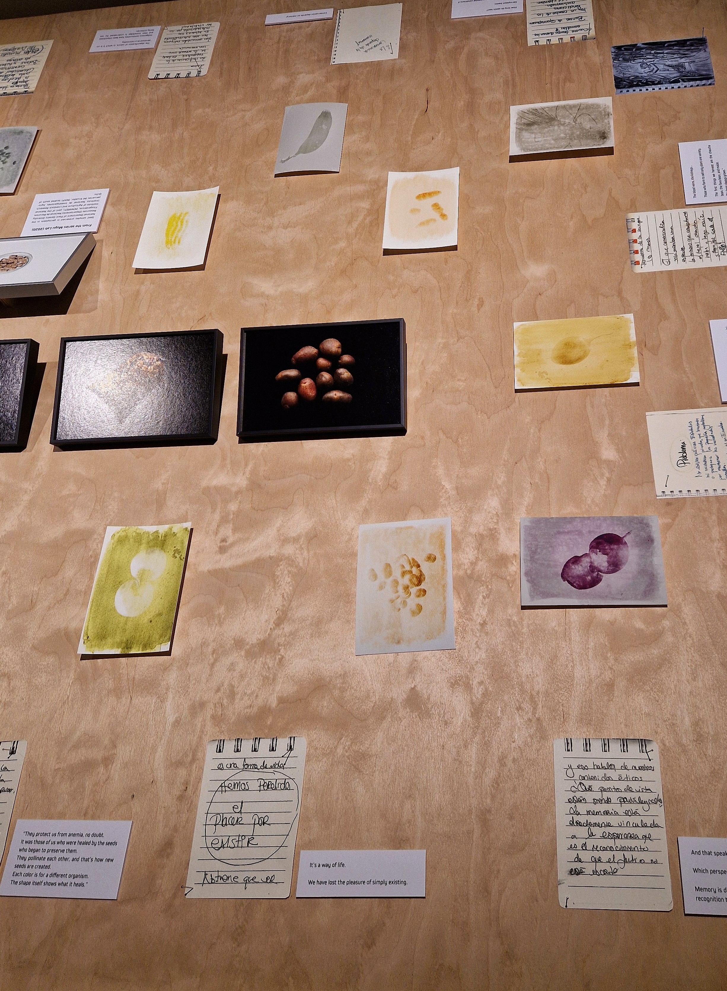 Finally, Colombia—the country of Romero’s grandparents—is approached from a more personal angle in the video Blood is a Seed, the central work of the exhibition’s final section. In it, Romero explores family memory and discovers that her great-grandmother was herself a “seed keeper.” The film, created with expired 35mm film, unfolds as a dialogue between the artist and her father, reflecting on the transformation of Colombia’s agricultural landscape. This sensitive work concludes the exhibition on an introspective note, interweaving personal legacy with collective memory.