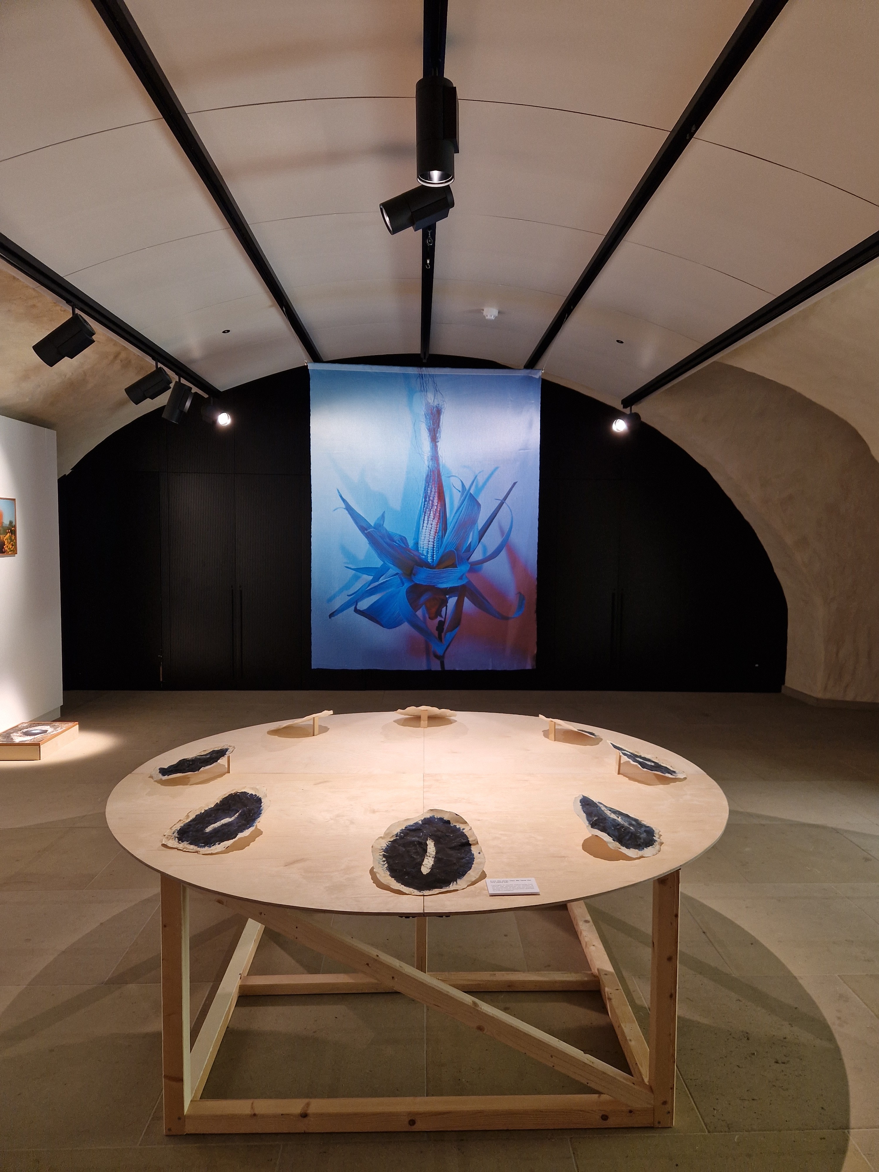 In Mexico, Romero focuses on corn plant, an emblematic crop whose cultivation in Oaxaca has been based for millennia on ancestral knowledge. Today, however, this diversity is threatened by the proliferation of agave, a plant grown for the production of tequila and much more profitable for agro-businesses to export. The photographic series is accompanied by a circular table displaying cyanotypes printed on tortillas, poetically evoking the evolution of maize through time—even incorporating speculative forms generated by artificial intelligence.