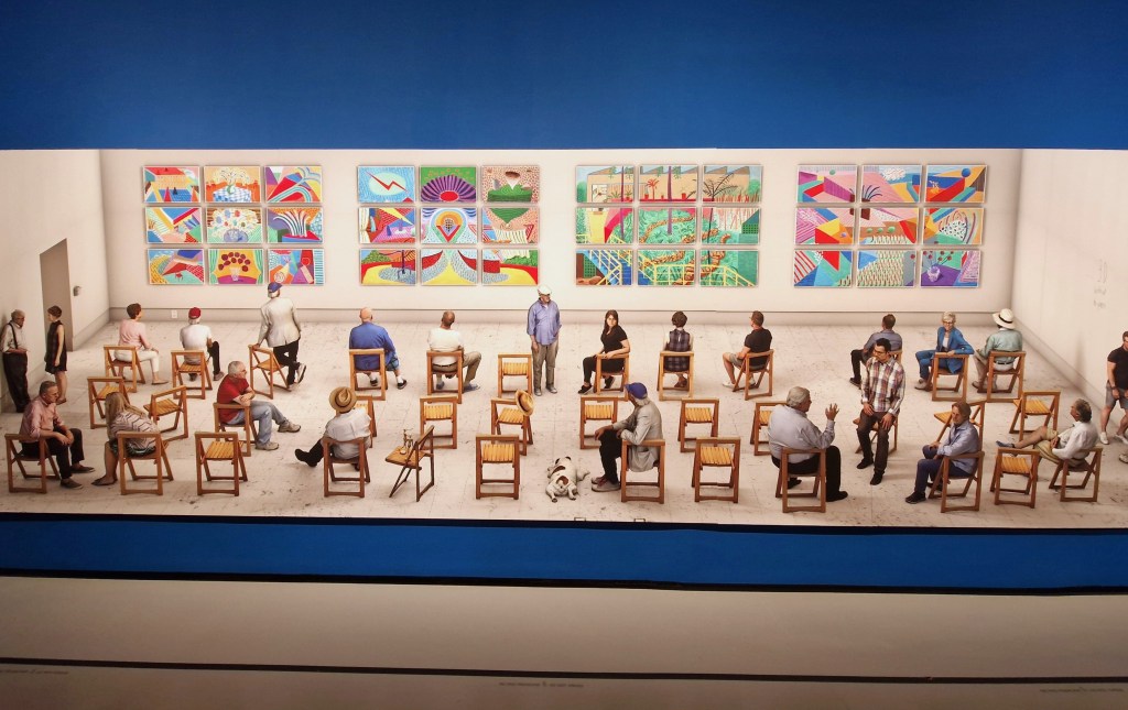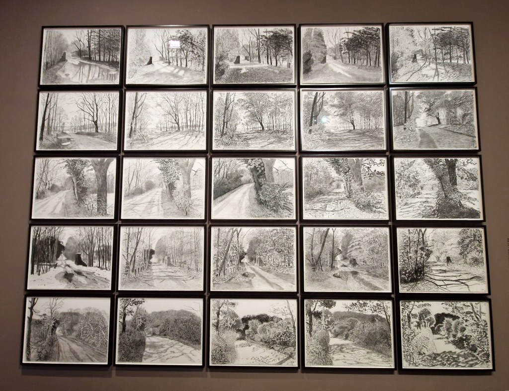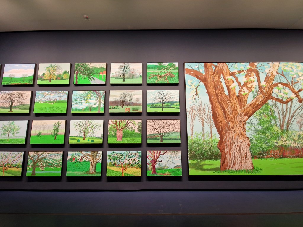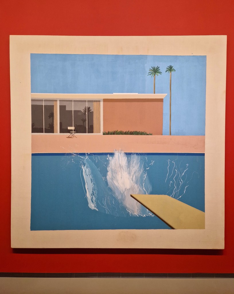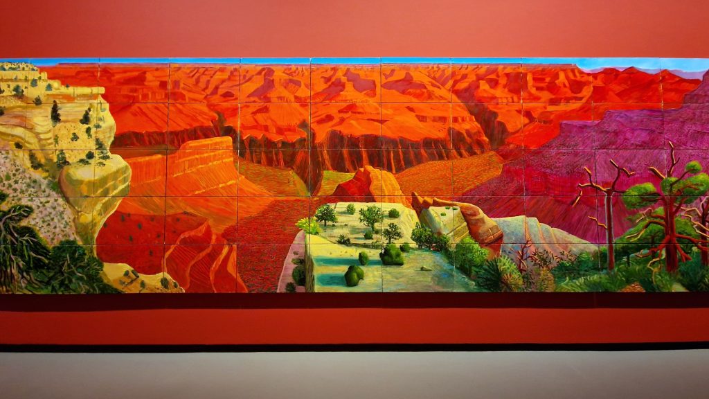 The exhibition opens with Hockney’s early works from his London years. It is striking to see how, from the very beginning, he remained faithful to figuration—even during periods when abstraction dominated the art scene. In 1964, Hockney moved to Los Angeles, a city that would become a central reference throughout his life. This section of the show presents some of his most emblematic works, including the celebrated A Bigger Splash. The paintings from this period reflect the brightness and clarity of the Californian environment, with stylised compositions, simple forms, and luminous colour palettes. Also featured are his panoramic views of the Grand Canyon, inspired by a trip to Arizona. The monumental A Bigger Grand Canyon already hints at Hockney’s fascination with juxtaposition and multiple points of view, a motif that will become increasingly prominent in his later works.