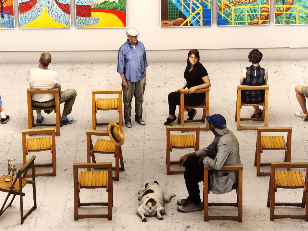 His interest in spatial experimentation—particularly in trompe-l’œil and multiple perspectives—is also explored through his photographic montages. By assembling various views of a single scene into one composition, Hockney produces images that are realistic and immersive, yet without a single focal point. The viewer’s eye is invited to wander across the entire surface, becoming an active participant in the scene. In the 2010s, he extended this process to video, resulting in works like A Bigger Space for Dancing. Using multiple cameras filming simultaneously, Hockney captures the dynamic essence of a ballet class. The effect is intensified by the exhibition design: the video is projected in a mirrored space reminiscent of a dance studio, creating an engaging, all-encompassing experience.