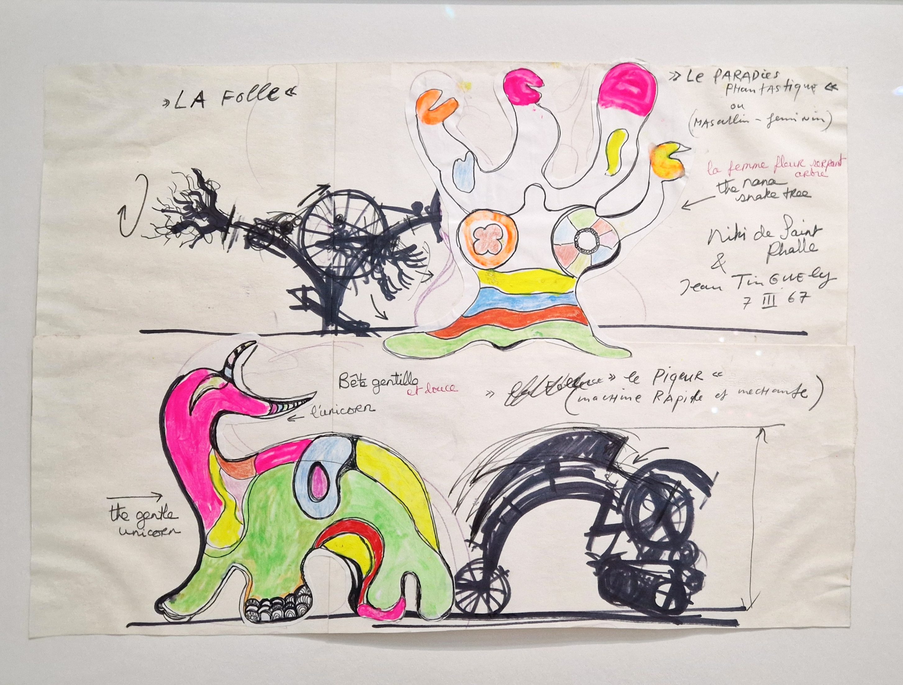 In 1973, Hulten was called to Paris for a prestigious mission: defining the identity of the newly created Centre Pompidou as its first director. Archival photographs and documents included in the exhibition recall this foundational moment for one of the world’s most influential museums of modern art. Hulten championed Saint Phalle and Tinguely within this institutional framework, valuing the openness, accessibility and experimental energy that characterised their work. A powerful example of this is Le Crocrodrome de Zig & Puce, presented in its project details in one of the final sections of the exhibition. This monumental installation, realised in 1977 in the Pompidou forum, was conceived collaboratively by Tinguely, Saint Phalle and Bernhard Luginbühl. Built publicly over several months under the eyes of visitors- and later destroyed just as openly – it embodies their belief in art as an evolving, shared and collective process.