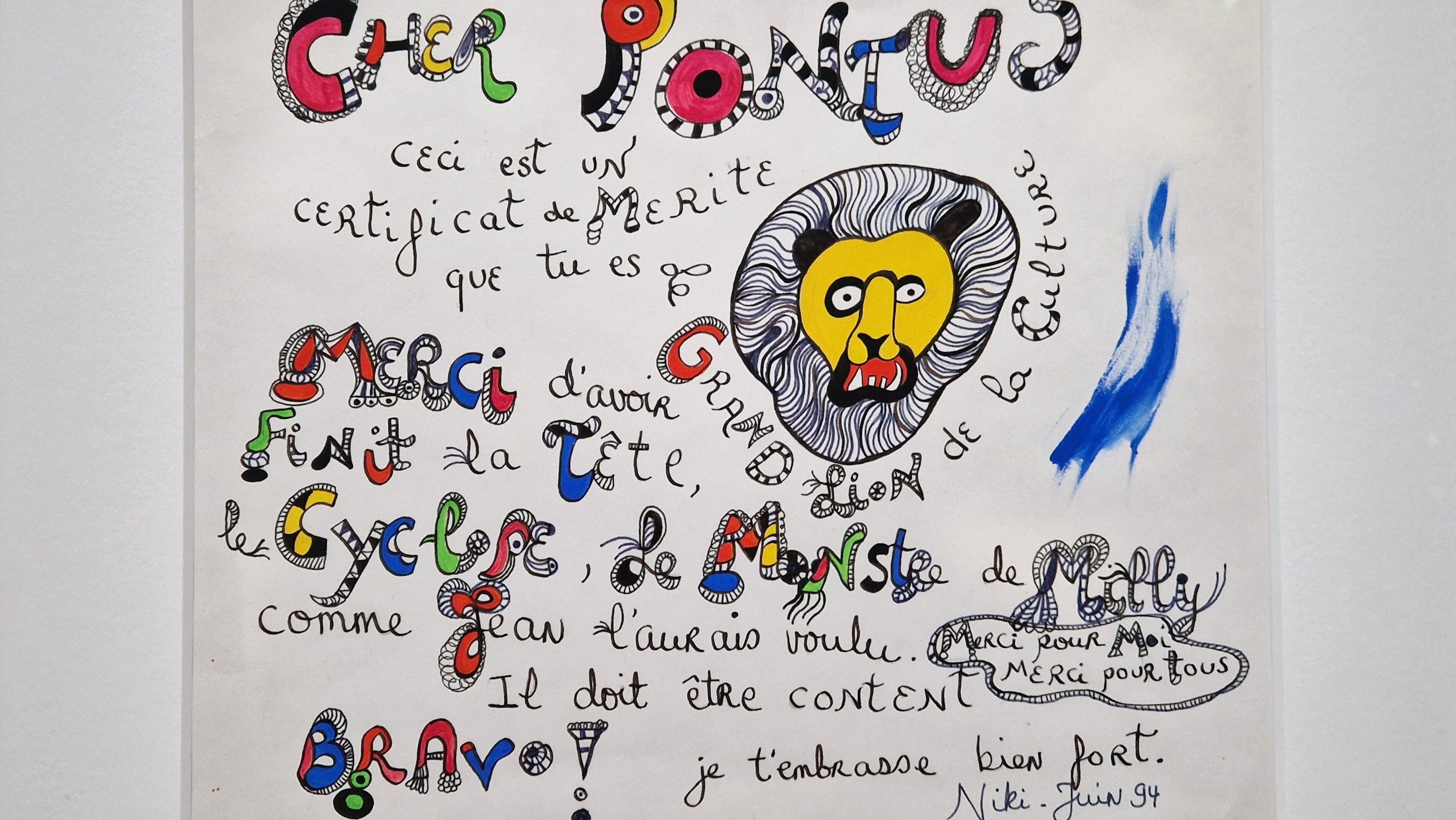 Their legacy continues through the monumental Cyclop in Milly-la-Forêt, a secretive construction to which Tinguely devoted decades of work. After his death, Saint Phalle completed the project following his wishes, with Hulten’s support. Unveiled in 1994, the Cyclop remains visitable today, a testament to their shared ambition and resilience. A thankful drawing-letter shows the gratitude of Niki towards Hulten after achieving this projet (cover photo).