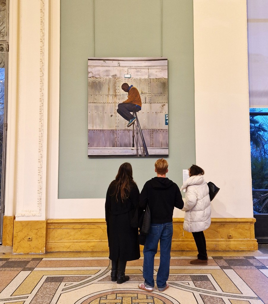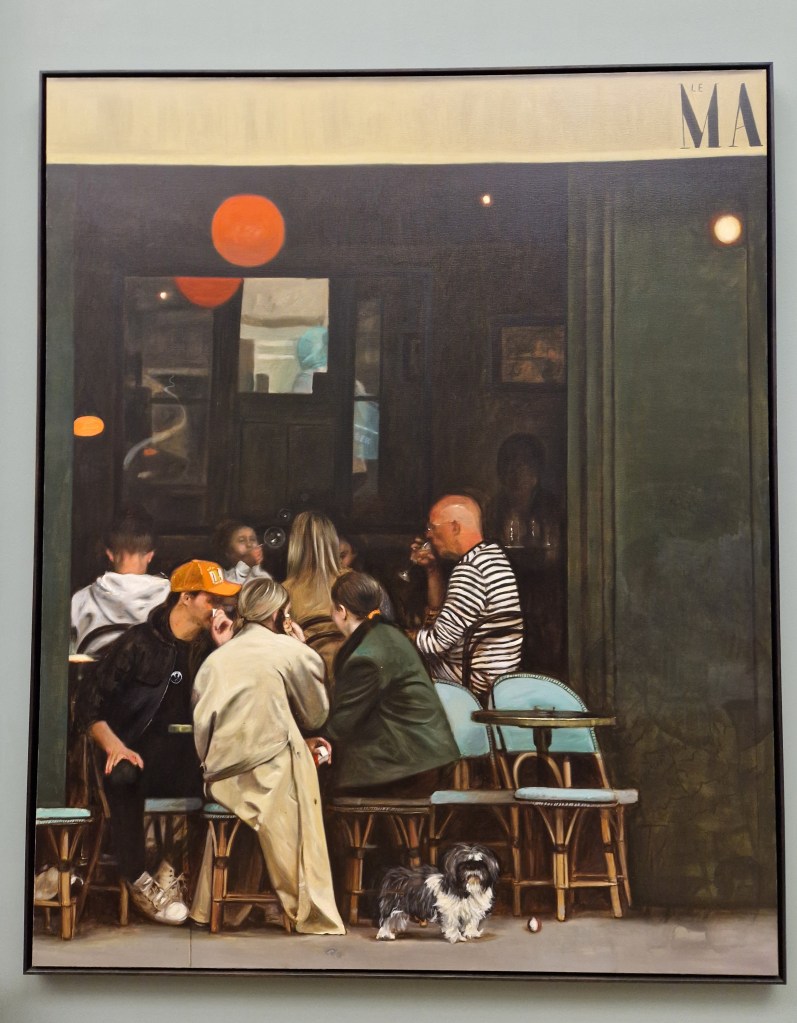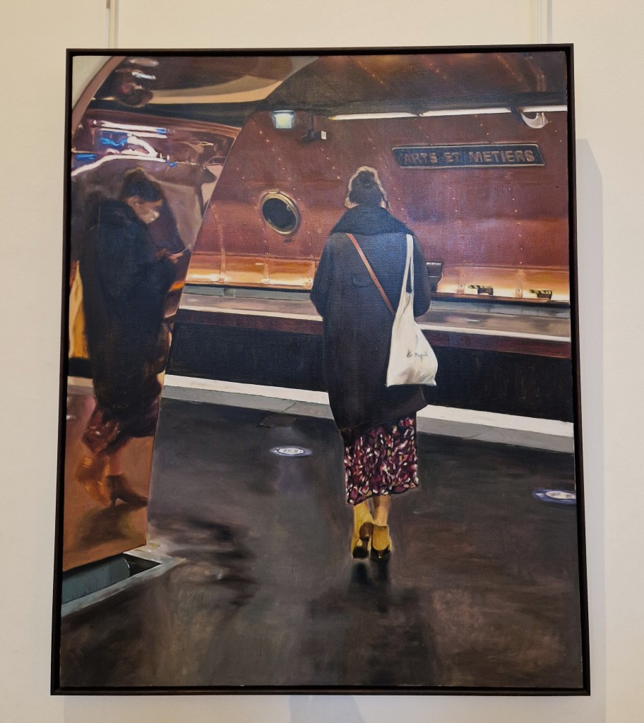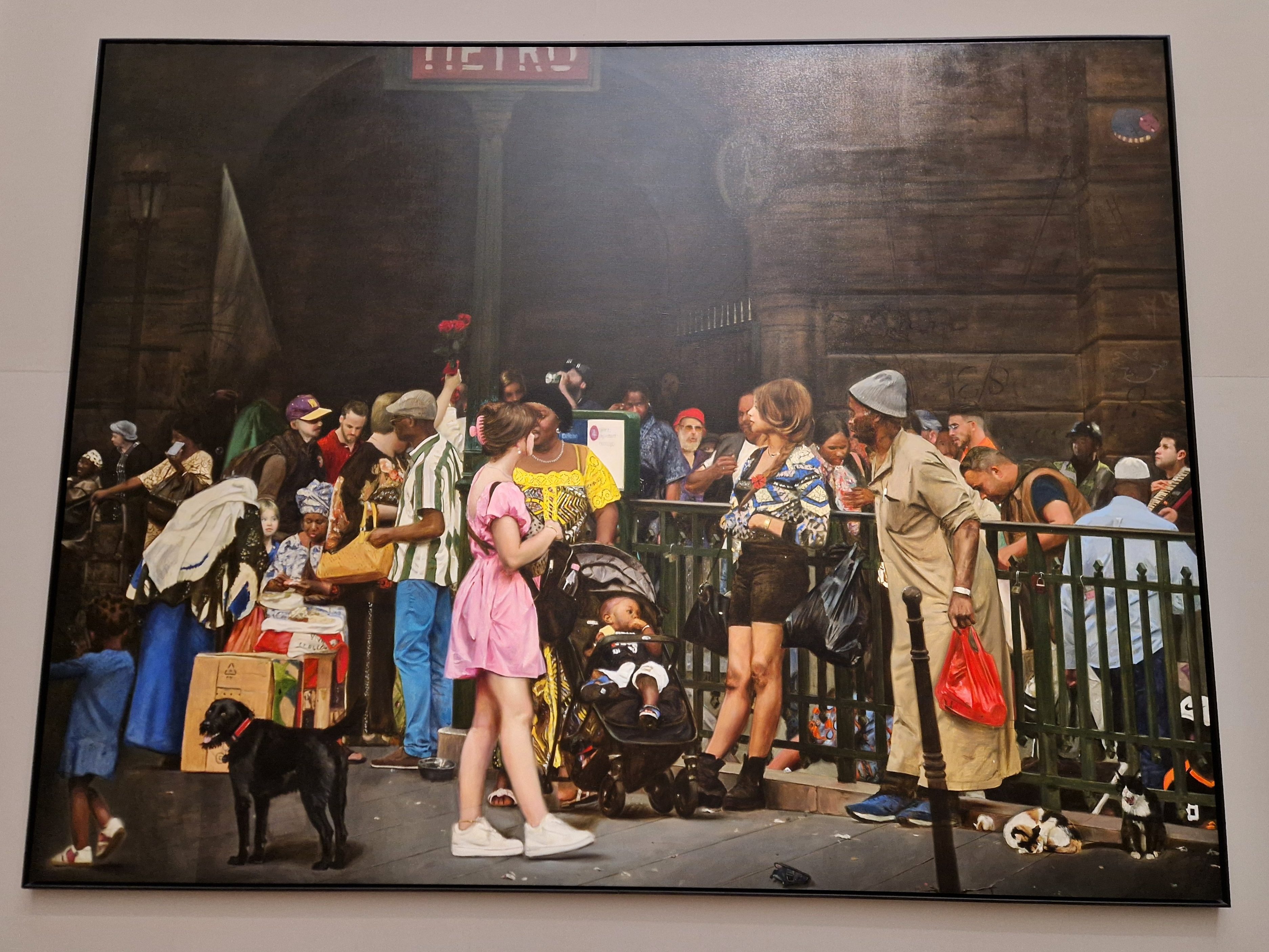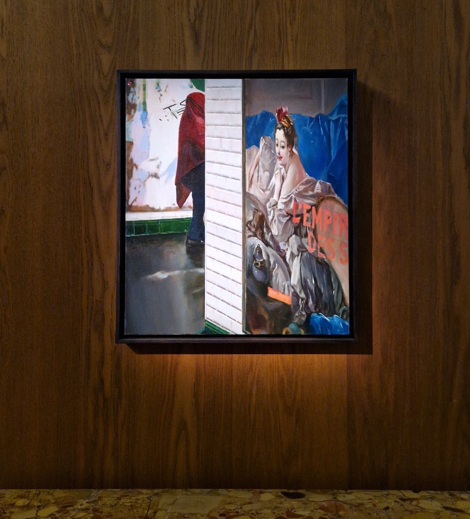 Bar interiors, metro station entrances, everyday scenes frozen in time: these motifs recur throughout Hamdad’s paintings. Yet beyond their apparent immediacy lies a deep engagement with art history. His references draw extensively from the Old Masters, such as Rubens, Caravaggio, Velázquez, whom he has studied closely. This lineage becomes visible not only in compositional choices and lighting effects but is also explicitly highlighted in the exhibition’s wall labels, which place Hamdad’s works alongside reproductions of their historical sources.